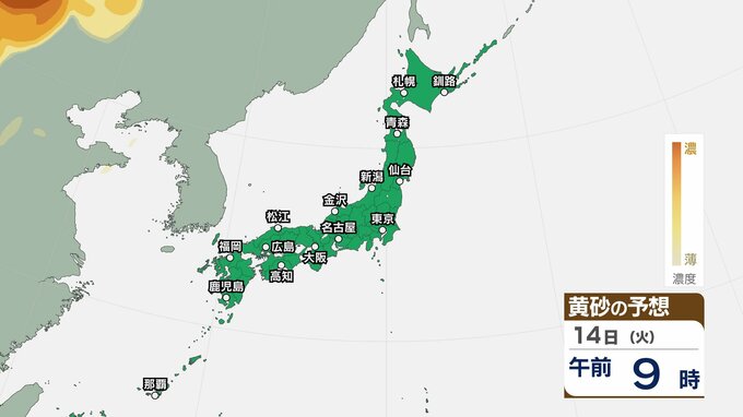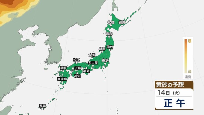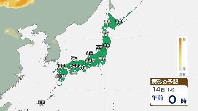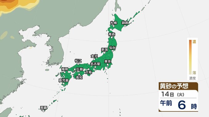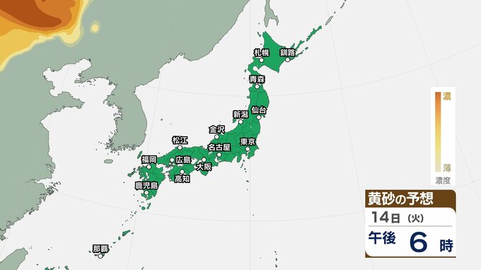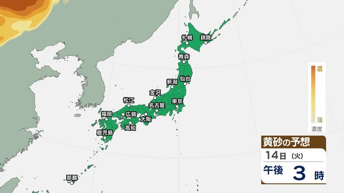 【黄砂情報】きょう11日(土)からしばらくの間「日本列島」に飛来か…九州・中四国・近畿・東海・関東・東北など 広い範囲で影響の可能性 11日(土)~14日(火)黄砂シミュレーション【気象庁 11日現在】 RSK山陽放送 2026年4月11日(土) 11:30 国内 天気 14日(火) 11日(土)~14日(火)黄砂シミュレーション 11日(土)~14日(火)黄砂シミュレーション 飛来が予測されるエリアでは、洗濯物などを屋外で干す際は注意が必要です。また目、鼻、皮膚などに関するアレルギー体質の方や、喘息など呼吸器に疾患がある方は、十分に注意してください。