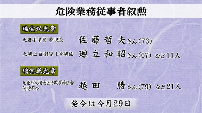 このうち瑞宝双光章は元岩手県警警視長の佐藤哲夫さん73歳や元海上自衛隊1等海佐の廻立和昭さん67歳など11人、瑞宝単光章は元釜石大槌地区行政事務組合消防司令の越田勝さん79歳など21人に贈られます。発令は今月29日です。