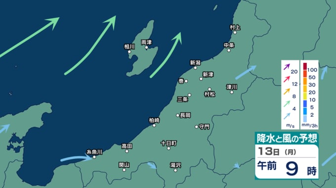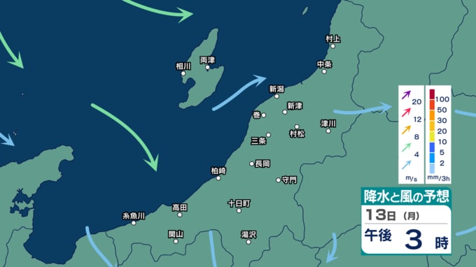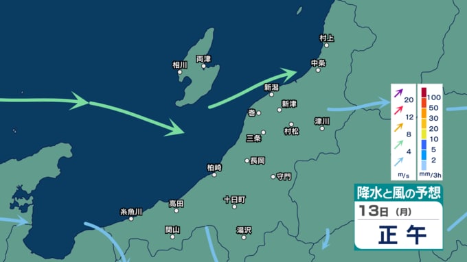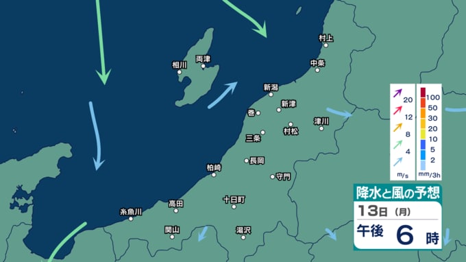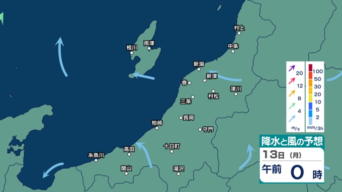 新潟県下越・佐渡ではあす12日にかけて強風や落雷、ひょう、急な強い雨に注意 来週16日(木)ごろに雨の時間帯か【11日(土)~16日(木)の雨風シミュレーション・11日午後5時更新】 新潟放送 2026年4月11日(土) 17:02 13日(月)の雨と風のシミュレーション