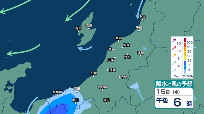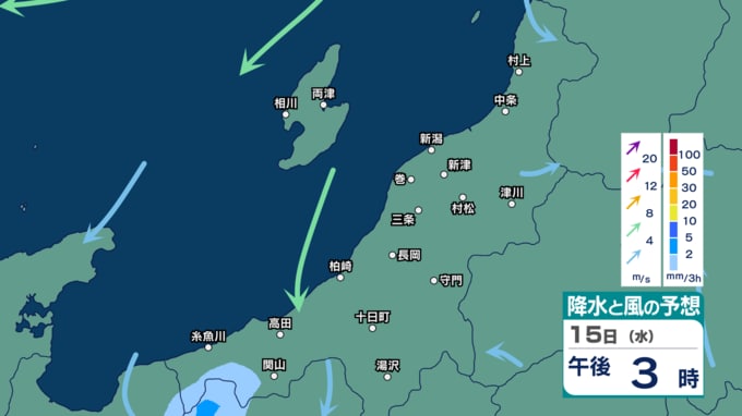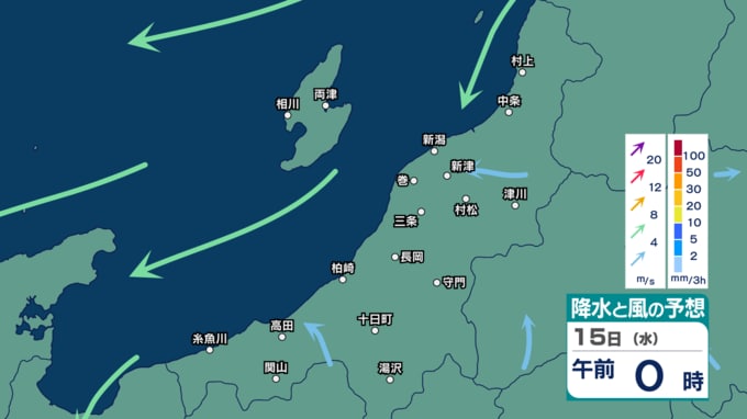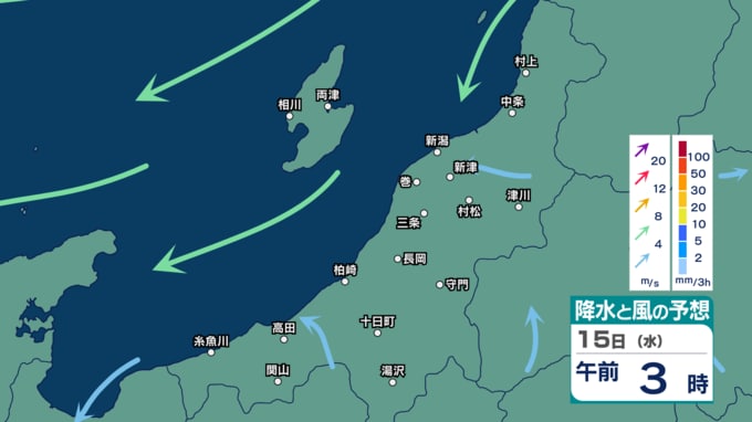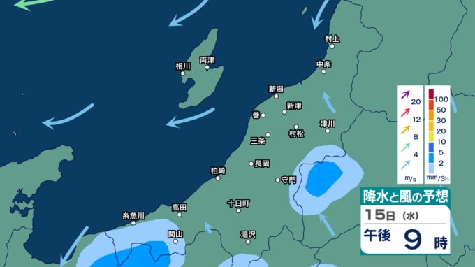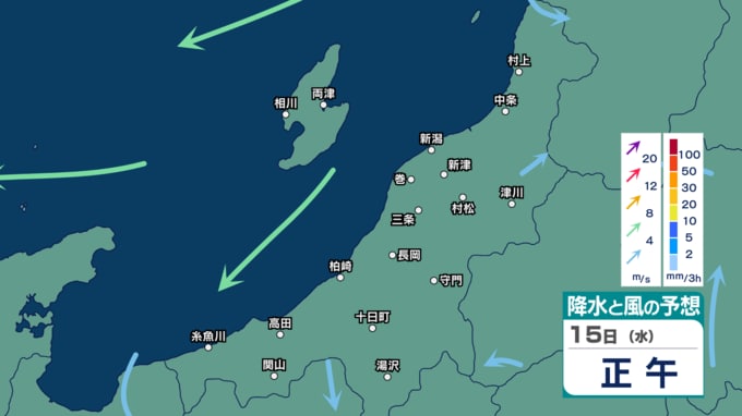 新潟県下越・佐渡ではあす12日にかけて強風や落雷、ひょう、急な強い雨に注意 来週16日(木)ごろに雨の時間帯か【11日(土)~16日(木)の雨風シミュレーション・11日午後5時更新】 新潟放送 2026年4月11日(土) 17:02 15日(水)の雨と風のシミュレーション