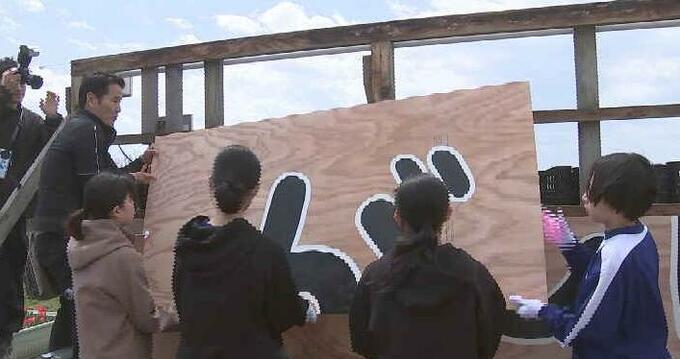 作業には市民団体「がんばろう!石巻の会」のメンバーや、地元の中学生らおよそ30人が参加し、古い看板を外した後、新しいものを取り付けていきました。