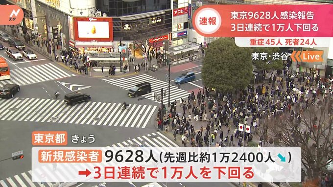 新型コロナウイルスについて、厚生労働省はきょう、東京都で9628人の感染が報告されたと発表しました。厚生労働省によりますと、東京都できょう新たに報告された感染者は9628人でした。正月の三が日ということもあ…