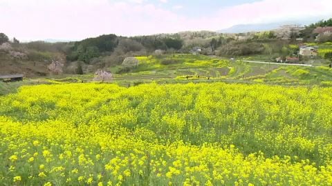 日本の「つなぐ棚田遺産」に認定されている西谷棚田ではいま菜の花が見頃を迎えています。これにあわせて、11日からイベントが始まりました。会場では棚田の風景の写真が展示されているほか、手づくりのすべり台もあります。