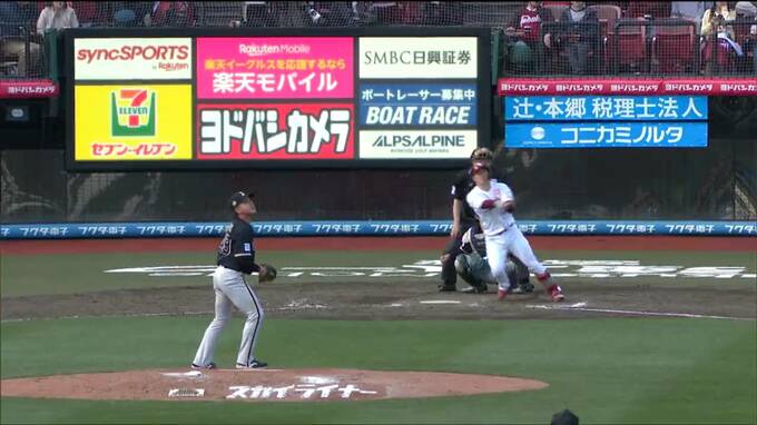 楽天の先発は、今シーズン一軍初登板の早川隆久投手。強風が吹きすさぶ中、2025年9月以来の一軍のマウンドは4回までノーヒットに抑えるピッチング。5回にはノーアウト満塁のピンチを迎えますが、ダブルプレーで乗りきり、1点は与えたものの最少失点で切り抜けます。