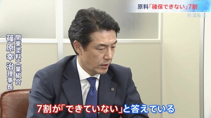 「原料として溶剤の確保ができていないということ。4月に調達しなければいけない原料がありますよね。それがまず『確保できていますか・できていませんか』ということに対して、7割が『できていない』と答えています。一部の溶剤も3月上旬からストップしているような状態で、極めて厳しい状況に置かれています」