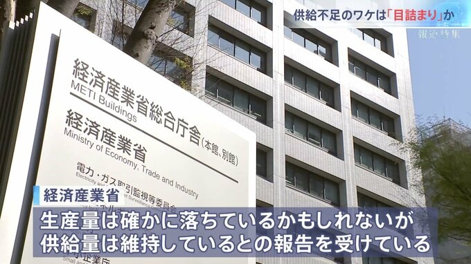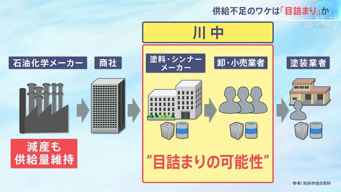 政府の説明では、川上の石油化学メーカーは減産しているものの、川中への原料の供給量は、輸出を減らすなどして維持できているという。その川中にあたるメーカーや卸売・小売業者の間で流通が滞り、目詰まりが起きている可能性があるとしているのだ。