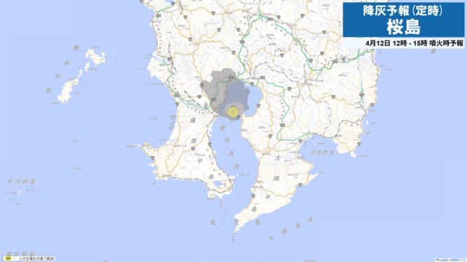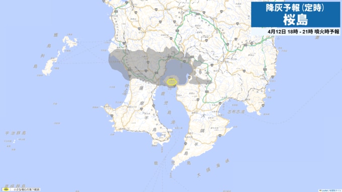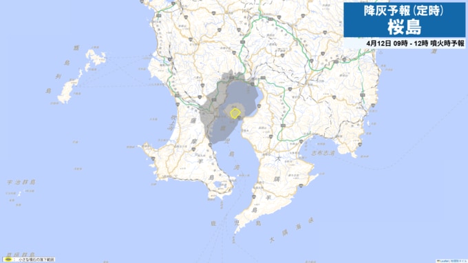 桜島で噴火が発生した場合には、12日09時から12時までは火口から北方向、12日21時から24時までは火口から東方向に降灰が予想されます。