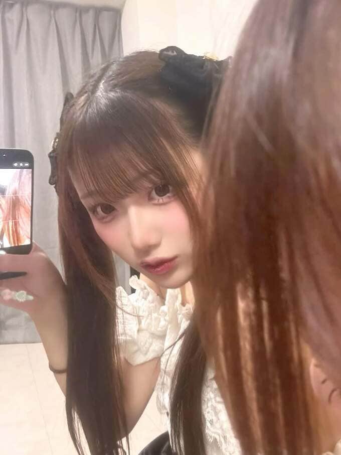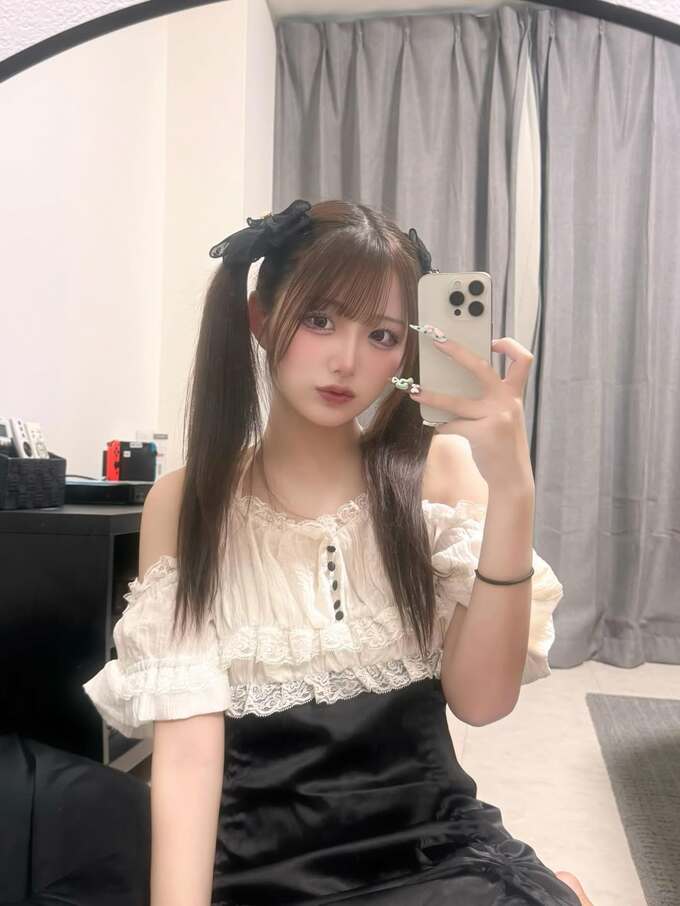 投稿された画像では、白いレースのオフショルトップスと黒のサテン風ドレスを組み合わせたコーディネートに身を包んだ希空さんの姿が映し出されています。ヘアスタイルはツインテールで、左右に大きな黒いリボンのヘアアクセサリーを添え、地雷系の世界観を丁寧に表現。大きな瞳と長いまつ毛を際立たせたアイメイクと、ほんのり紅潮した頬が印象的です。
