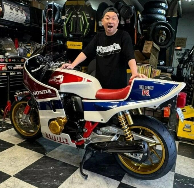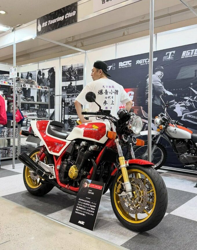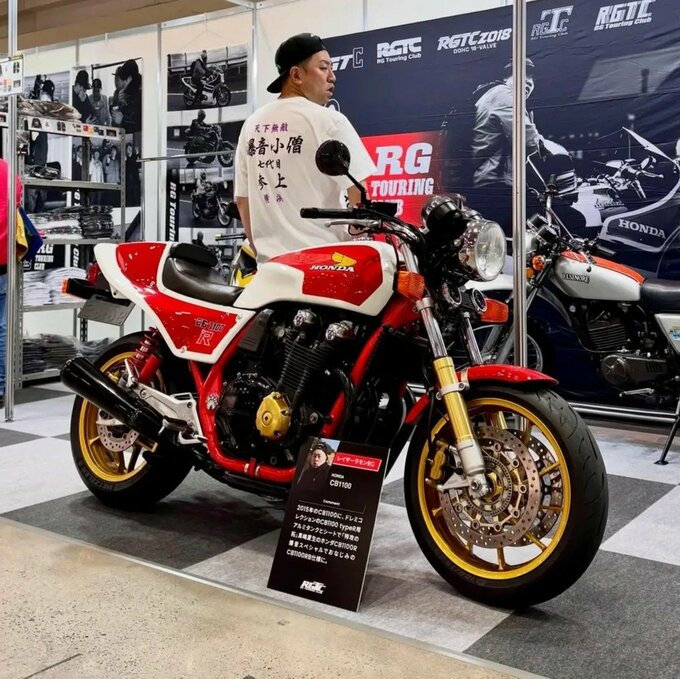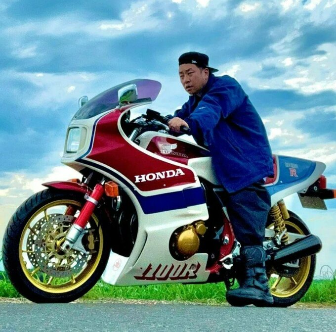 3月29日の投稿で、レイザーラモンRGさんは「特攻の拓 "真嶋夏生"さんの "爆音スペシャル"CB1100RB1風のCB1100に 以前"特攻の拓展"で"購入"した"爆音小僧"Tシャツ…だと?」と綴り、この バイクの写真共に投稿していました。
