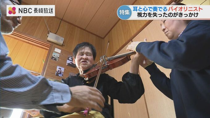 50代で全盲に…73歳のバイオリニスト「自分が変わっていく」胆のうがんで逝った夫の言葉と″一輪の夢” 長崎放送 2026年4月12日(日) 19:00 国内 3人がかりの贅沢で独特なレッスン レッスンは先生一家3人がかりです。長嶋さんが右手を、長嶋さんの妻・園子さんが左手をサポートし、さらに息子の奏輔さんが伴奏してくれるという贅沢さです。