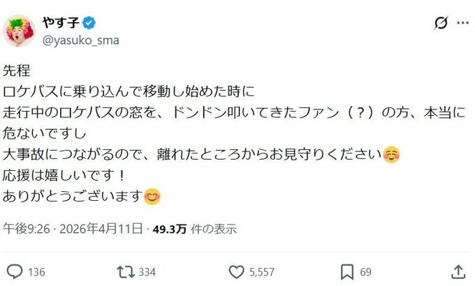やす子さんは「先程 ロケバスに乗り込んで移動し始めた時に 走行中のロケバスの窓を、ドンドン叩いてきたファン(?)の方、本当に危ないですし 大事故につながるので、離れたところからお見守りください」と、投稿。