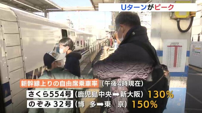 JR西日本によりますと、午後4時現在、新幹線上りの自由席乗車率は、鹿児島中央発~新大阪行きの「さくら554号」が130パーセント。博多発~東京行きの「のぞみ32号」が150パーセントとなっています。