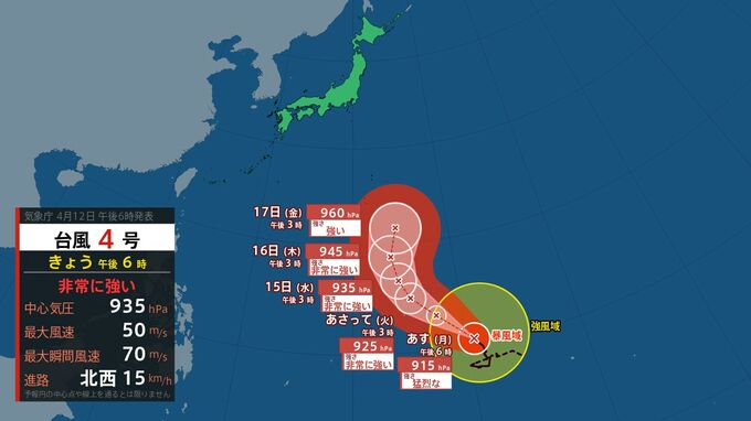 非常に強い勢力の台風4号はきょう(12日)午後3時には、