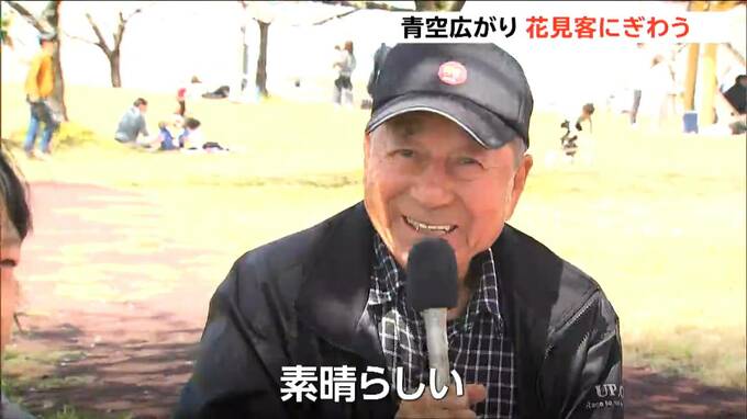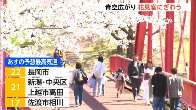12日の新潟県は高気圧に覆われ青空が広がりました。長岡市では花見をする人でにぎわいました。