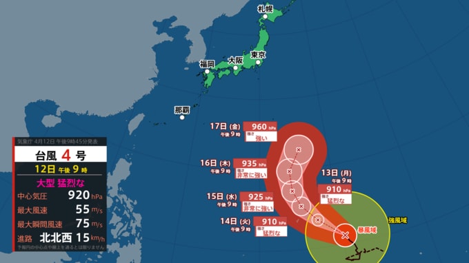 気象庁によりますと、大型で猛烈な台風4号は、12日21時にはトラック諸島近海にあって、北北西に1時間に15キロメートルの速さで北北西に進んでいます。中心の気圧は920ヘクトパスカル、中心付近の最大風速は55メートル、最大瞬間風速は75メートルです。