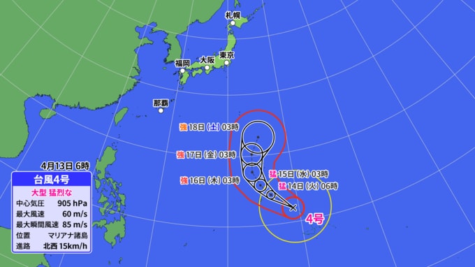 気象庁によりますと、大型で猛烈な台風4号は、13日6時にはマリアナ諸島にあって、1時間に15キロメートルの速さで北西に進んでいます。中心の気圧は905ヘクトパスカル、中心付近の最大風速は60メートル、最大瞬間風速は85メートルです。▼13日6時の実況