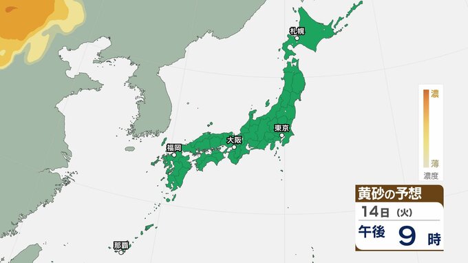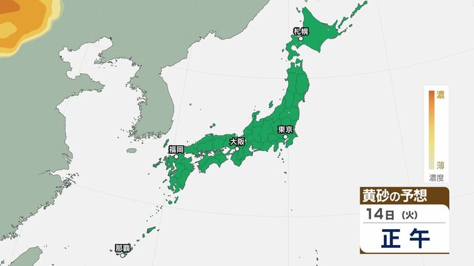 【黄砂情報】きょう13日(月)も「日本列島」に飛来か…北陸・東北の一部地域で影響の可能性 13日(月)~16日(木)黄砂シミュレーション【気象庁 13日現在】 RSK山陽放送 2026年4月13日(月) 09:42 国内 天気 14日(火)午後 ▶13日(月)~16日(木)黄砂シミュレーション画像 ▶13日(月)~16日(木)黄砂シミュレーション画像