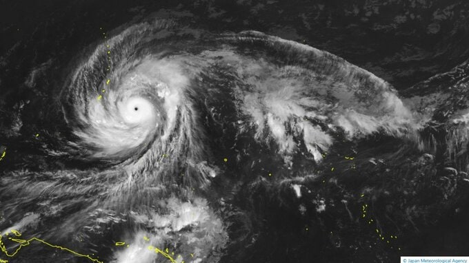 気象衛星ひまわりが映した台風4号(13日午前10時)。中心気圧は905ヘクトパスカルと異例の低さで、中心部にくっきりと、黒くなった部分が見えます。