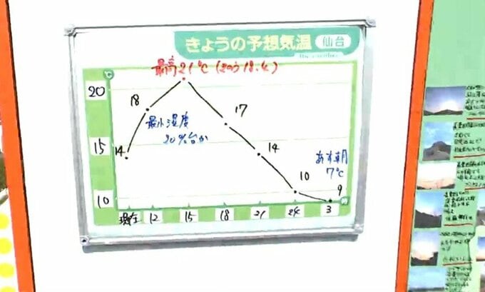 今日は内陸を中心に気温が上がりやすく、仙台でも昼過ぎにかけてどんどん気温が上昇していきます。体感的には風が強い場面もありますが、寒くはないでしょう。夕方以降も上空の暖かな空気の影響で冷え込みが強まることはなく、14日の朝の最低気温は7℃と今朝と同程度の見込みです。