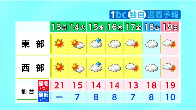 今後1週間を見ると、曇りや晴れの日が多く続く見込みですが、明後日(15日・水曜)は気圧の谷や湿った空気の影響で午後から傘が必要になるでしょう。最高気温は金曜(17日)までは平年並みですが、土曜(18日)以降は平年よりも高めとなる見込みです。