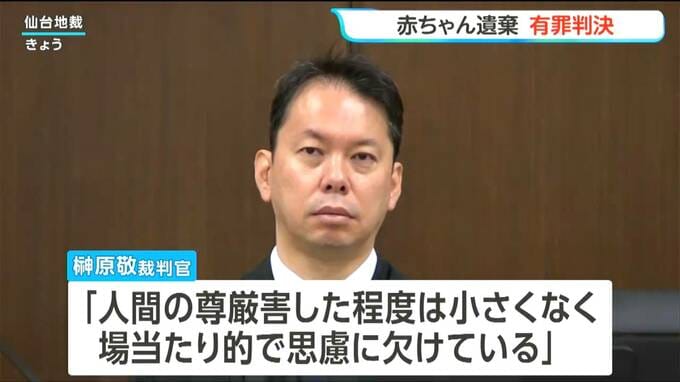 判決を受けたのは、宮城県名取市の23歳小売店販売員の女です。起訴状によりますと、女は2025年10月上旬、自分が出産した生後間もない男の赤ちゃんの遺体を自宅近くの駐車場の土の中に遺棄したとされています。