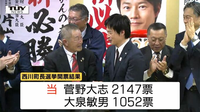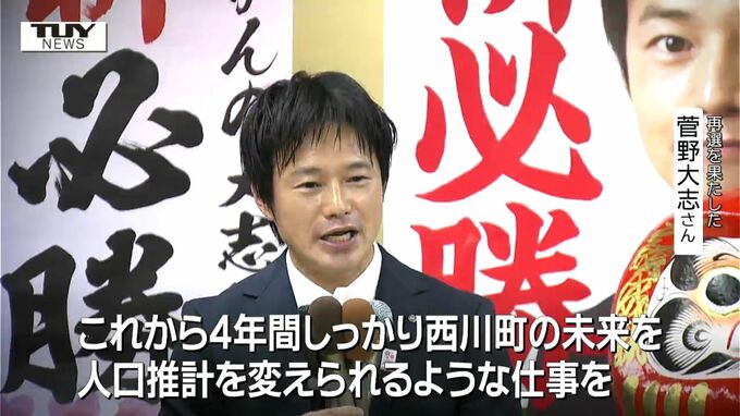 西川町長選では、現職の菅野大志さんが2147票を獲得し、初当選を目指した新人の大泉敏男さんに1000票以上の差をつけ、再選を果たしました。