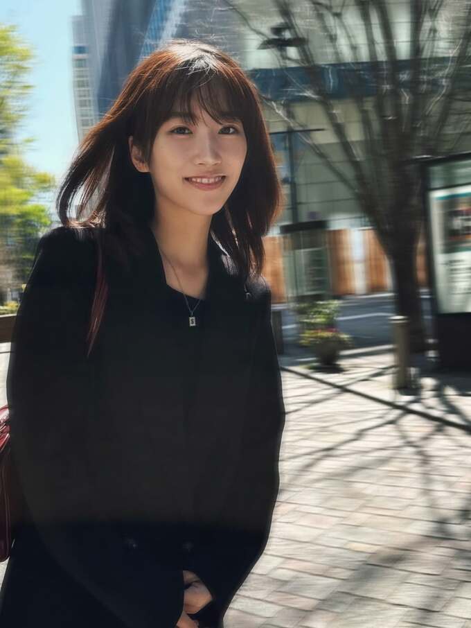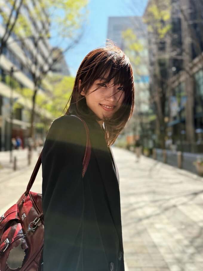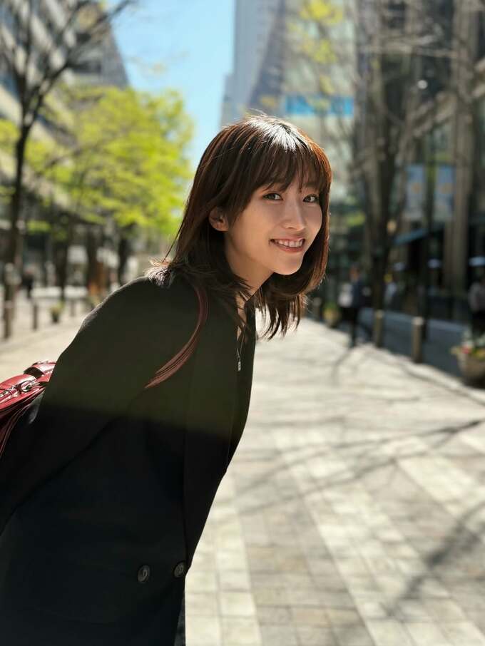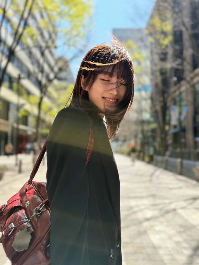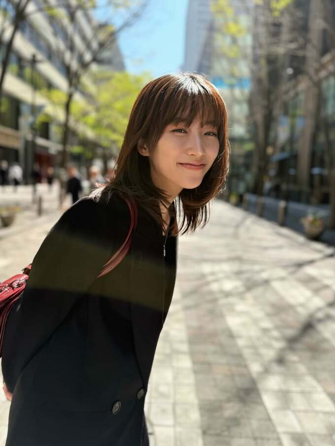 投稿された画像で片岡さんは、黒いコートに赤いリュックというスタイリッシュなコーディネート。高層ビルが立ち並ぶ都心の街路を歩きながら、カメラに向かってふと振り返り、髪が風になびく中で穏やかな笑顔を見せています。