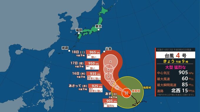 台風4号は発達の最盛期を迎えています。今後も暴風域を伴いながら北上を続け、週末は小笠原諸島に近づくおそれがあります。小笠原諸島では荒れた天気になる可能性があるため、今後の情報にご注意ください。その後は北東方向へ進み、本州への影響はないでしょう。