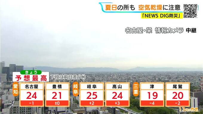 きょうの午後は、愛知県や岐阜県では晴れ間が広がるでしょう。三重県は雲が多い予想です。各地で空気が乾燥しやすくなるため、火の取り扱いにはご注意ください。