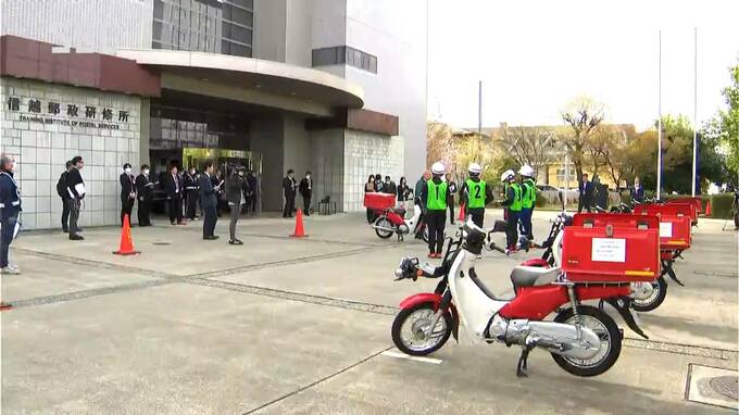 郵便配達を行う日本郵便の新入社員が研修に臨み、伝統の「赤いバイク」の乗り方などを訓練しました。