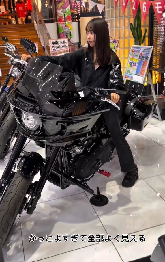 投稿された動画では、丸りおなさんが、様々なタイプのハーレーダビッドソンに跨りながら「大型取った私、念願のハーレー身に行ってきました」「かっこ良すぎて全部よく見える」と、投稿。