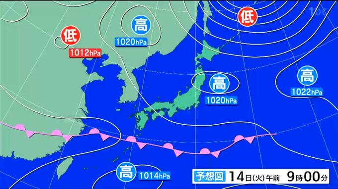 14日午前9時の予想天気図です。高気圧に覆われて晴れる所が多いでしょう。西日本は、気圧の谷や前線の影響で、所々で雨が降る見込みです。