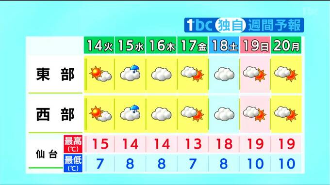 晴れや曇りの日が多いですが、15日水曜は、気圧の谷や湿った空気の影響で一時、雨が降るでしょう。最高気温は、金曜日まで平年並みかやや低いですが、その後は、平年より高くなりそうです。