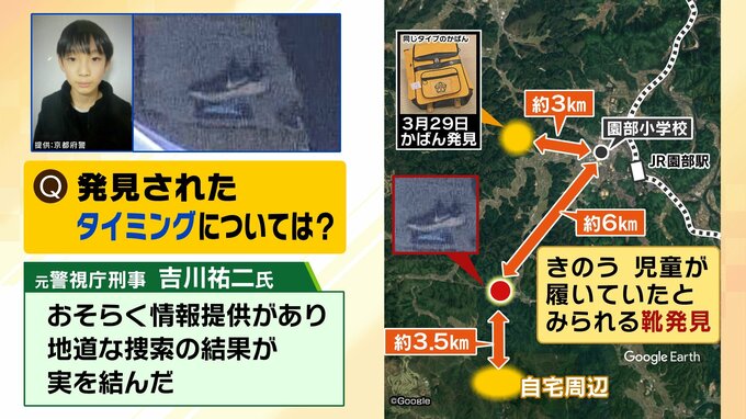 (吉川祐二氏)「通学かばんは小学校の北側で発見されているんですね。しかしその付近を捜索したという情報は入ってきていないことから、『北じゃない、南だよ』というレベルの情報は入った可能性が高いと思います」