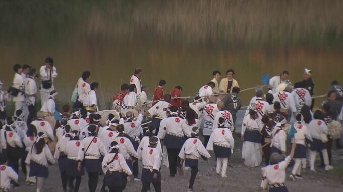 13日5時半ごろ、「宮川」に約3000人の関係者が集結。一度川で清めたヒノキ7本の水を切って、陸路で「外宮」へむけ「陸曳(おかびき)」です。