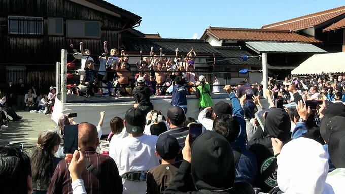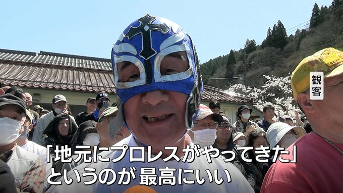 新庄村の魅力を発信するがいせん桜プロレスです。美しい桜並木もイベントで活気づく村を温かく見守っていました。