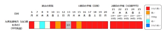 九州北部地方(山口県を含む)の向こう2週間の気温は、暖かい空気に覆われやすいためかなり高くなる見込みです。