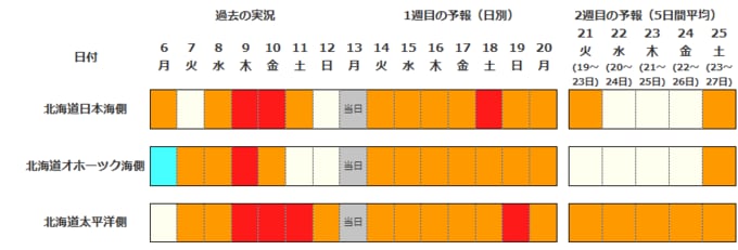 日本海側、オホーツク海側は21日ごろから平年並みの日が多いですが、太平洋側は19日ごろから平均気温が平年より高い日がほとんどです。