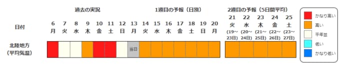 北陸地方の平均気温は、25日ごろまで平年より高い日が続く予想です。