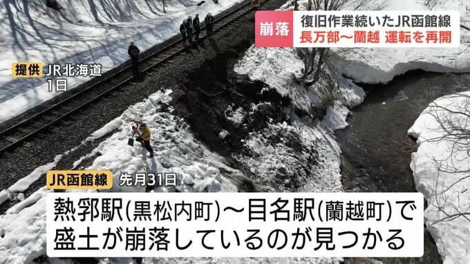 復旧作業のため、函館線は4月1日から長万部と蘭越の間で終日運転を見合わせていましたが、作業が終わったことから13日朝、運転を再開しました。
