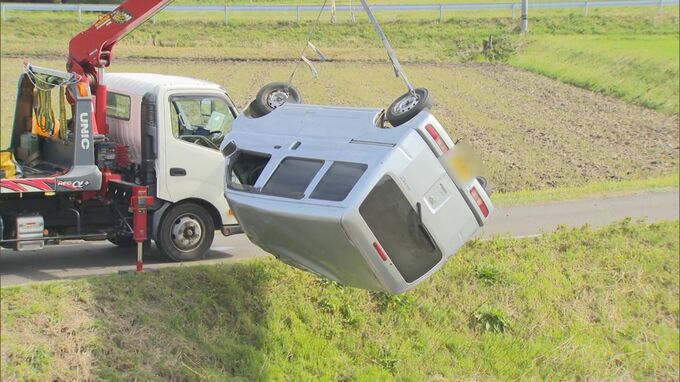 車は助手席側を下に横倒しになっていますが、用水路の水位はわずかで、警察が事故と病死の両面で調べています。