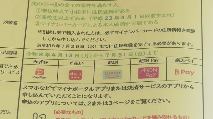 小松市スマートシティ推進課・中村宜嗣主幹「キャッシュレス決済を通して(キャッシュレスに)なじんでもらいたいという思いで今回こういう形をとっている。操作が不慣れな人もいると思うが、申請のサポート窓口を開設しているのでそちらを利用して申し込みしてほしい」