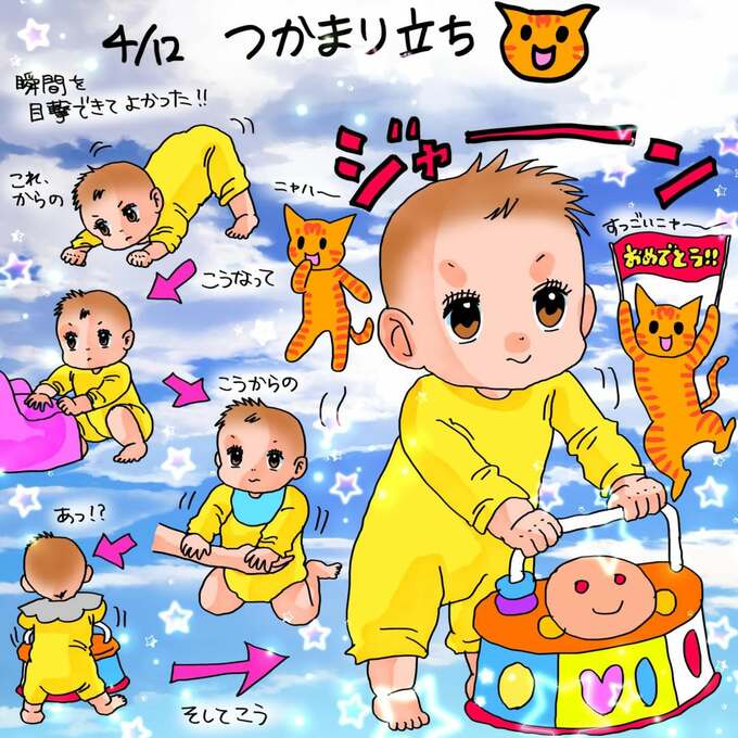 「な、なんと 弟くんがつかまり立ちしましたびっくり!」と興奮を隠しきれない様子で綴っています。おもちゃにつかまって立つ瞬間を目撃できたといい、「瞬間目撃できてよかった!」と喜びをあらわにしました。