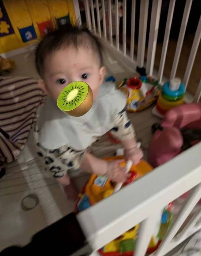 「ハイハイこそ筋トレとして大切らしいからハイハイも長くやってもらえた方がいいみたいですね」とコメントし、頭をぶつけないよう「みつばちクッション」を注文したことも明かしました。