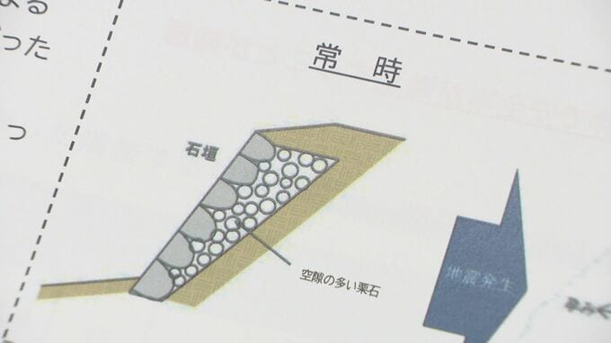 石垣は表面に積み上げる「築石(つきいし)」を背面に敷き詰めた「栗石(ぐりいし)」と呼ばれる小石が支えていて、これまでの調査で以前から栗石部分に隙間があり、強い揺れに耐えられず沈下したことが崩落につながったと指摘されています。