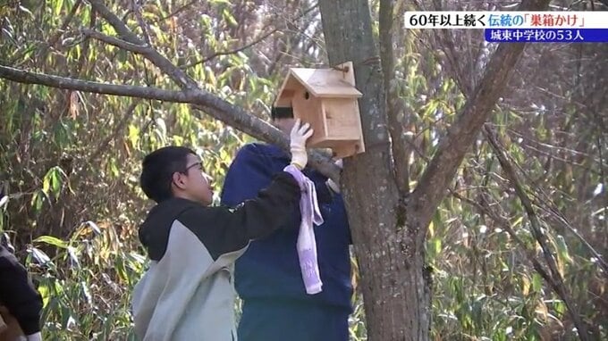 城東中学校では1964年ごろから毎年、鳥の繁殖が始まる今の時期に巣箱の設置を続けています。