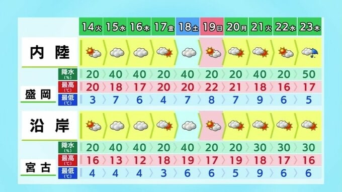 さて、この先1週間の天気を見ますと、16日(木)と18日(土)あたりは雲が広がりやすく雨がぱらつくところもありそうですが、15日(火)、17日(金)19日(日)は晴れて気温も内陸を中心に20度を超えそうです。