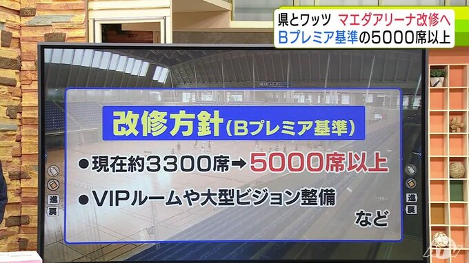 渡邊社長によりますと、マエダアリーナをBプレミアの基準に沿って、現在の約3300席から「5000席以上」に増設するほか、VIPルームや大型ビジョンなどを整備する方針です。