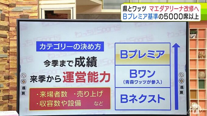 発表されたのは、青森市のマエダアリーナをBリーグのトップカテゴリ「Bプレミア」の基準に満たすために改修する方針です。