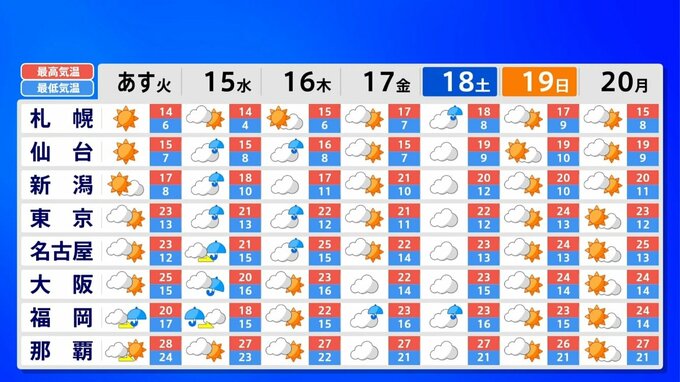 今週は、西日本や東日本ではぐずついた天気となりそうです。水曜日から木曜日にかけては、西日本と東日本の広い範囲で雨が降るでしょう。金曜日から土曜日にかけては、西日本を中心に雨の降るところがありそうです。気温は平年よりやや高い日が多いでしょう。